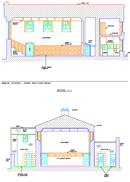 Detailed survey showing a slice through the building. This can just show structural elements on the section line or can show background detail such as doors and windows.